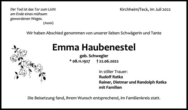 Trauer Emma Haubenestel 08/07/2022