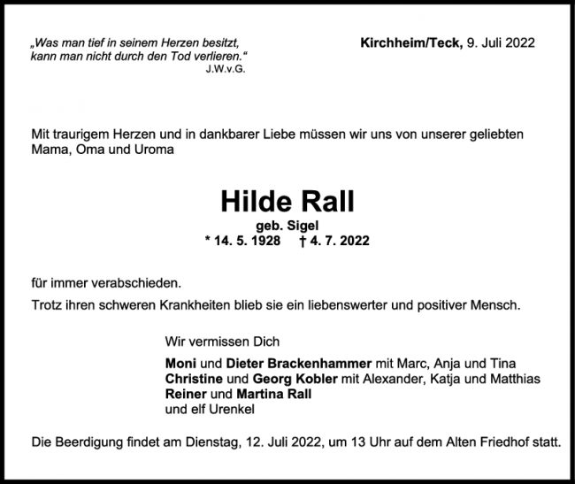 Trauer Hilde Rall 09/07/2022