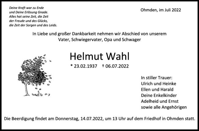 Trauer Helmut Wahl 09/07/2022