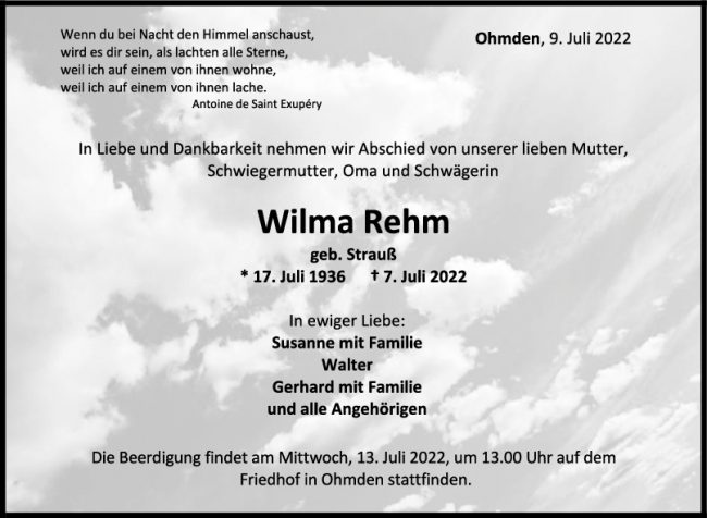 Trauer Wilma Rehm 09/07/2022