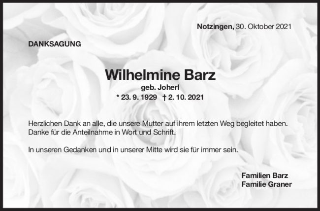 Danksagung Wilhelmine Barz