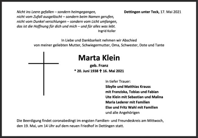 TodesanzeigeVon Benny Kuder18. Mai 2021Kommentar hinterlassen