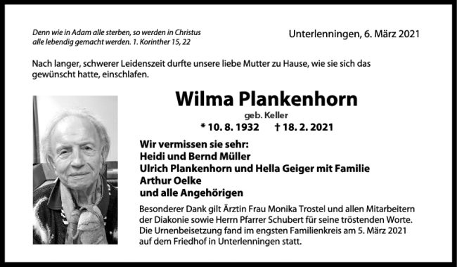 Trauer Wilma Plankenhorn