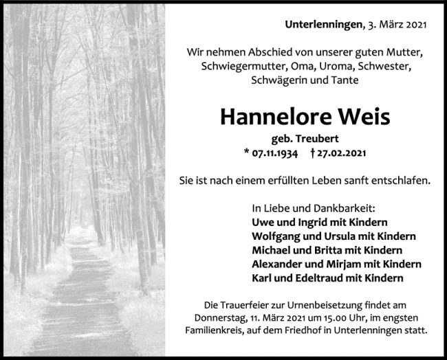 Trauer Hannelore Weis