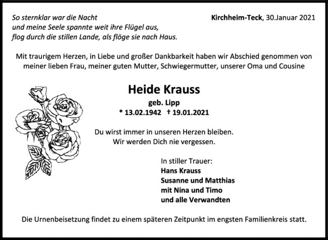 TodesanzeigeVon Benny Kuder30. Januar 2021Kommentar hinterlassen