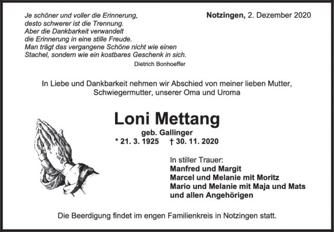 Trauer Loni Mettang
