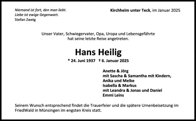 TodesanzeigeVon Benny Kuder25. Januar 2025Kommentar hinterlassen