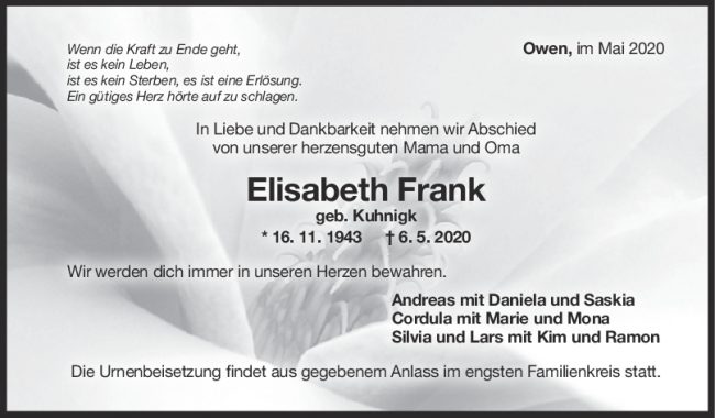 Trauer Elisabeth Frank