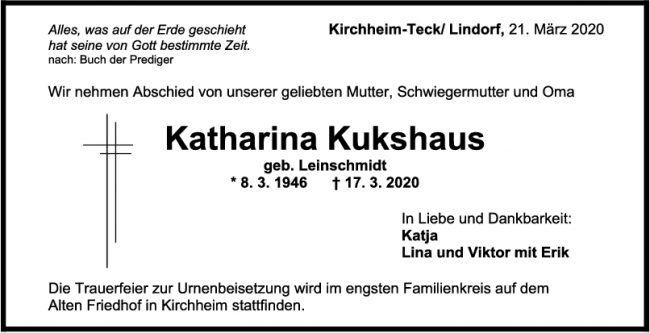 TodesanzeigeVon Benny Kuder22. März 2020Kommentar hinterlassen