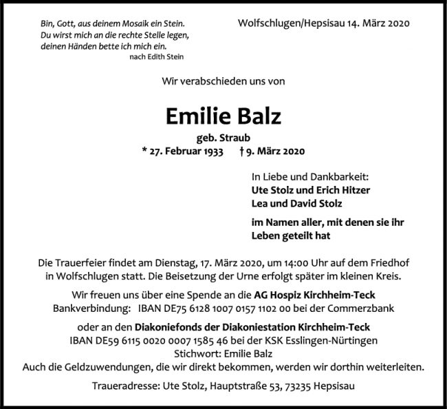 Trauer Emilie Balz
