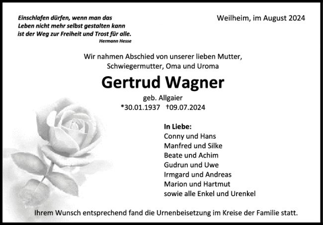 Trauer Gertrud Wagner
