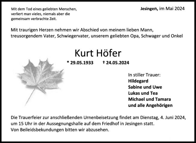 Trauer Kurt Höfer