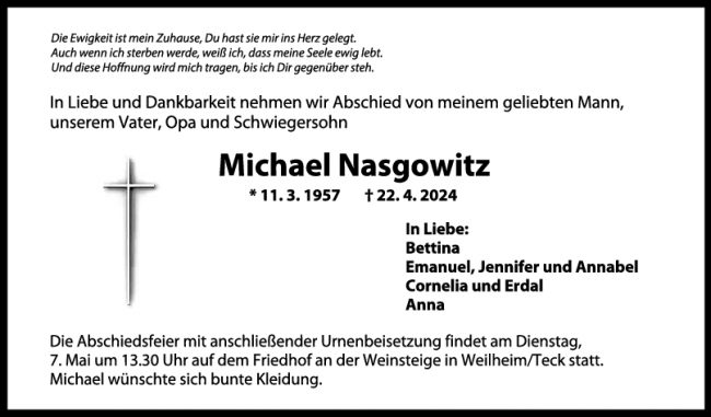 TodesanzeigeVon Trauerportal30. April 20241 Kommentar